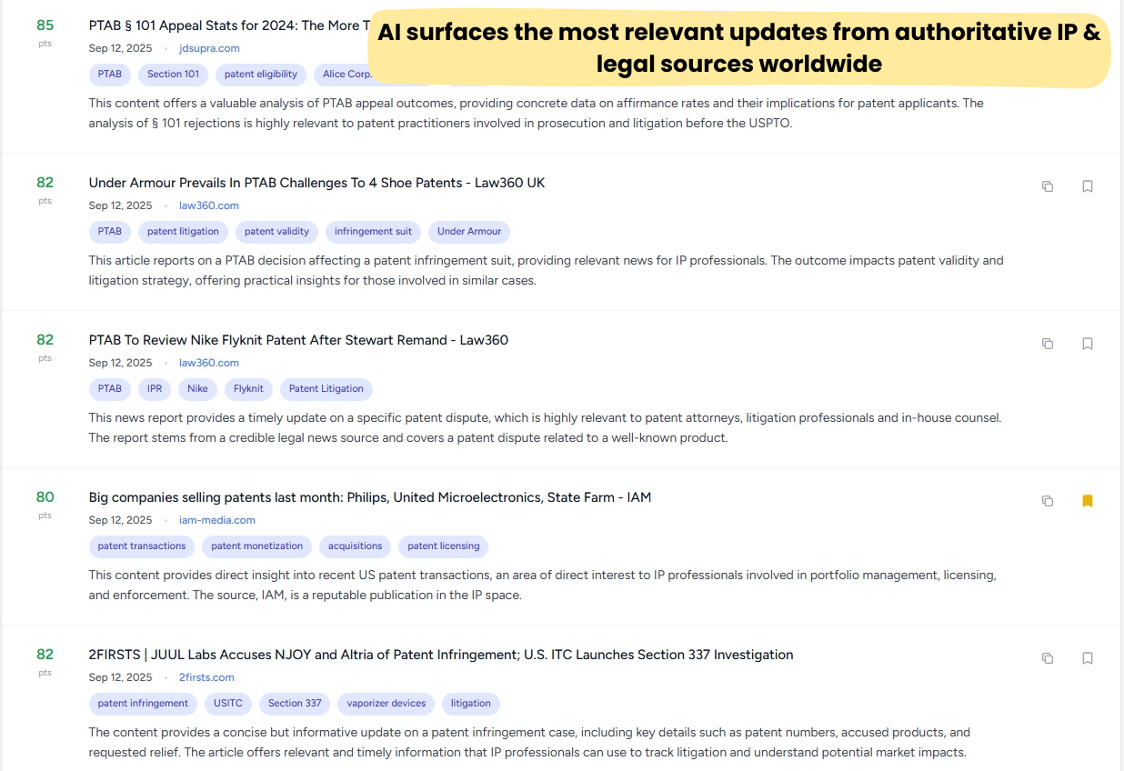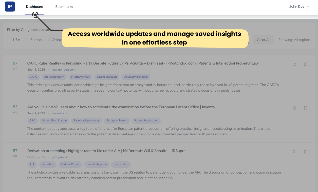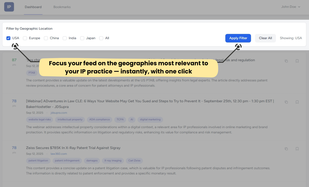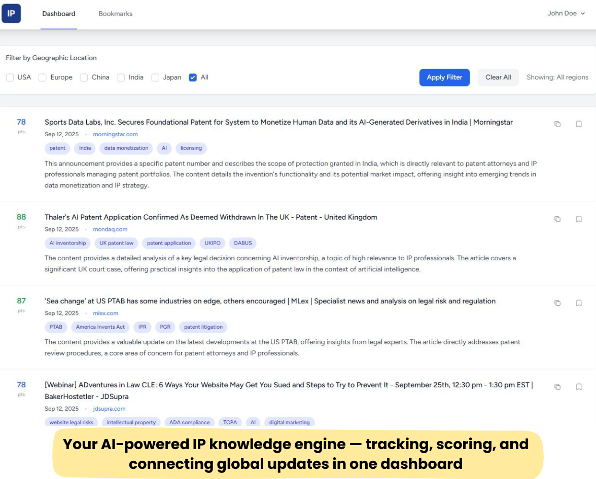 Explore how our AI-powered dashboard curates the most relevant IP updates, filters by geography, and delivers actionable insights — all in one place
